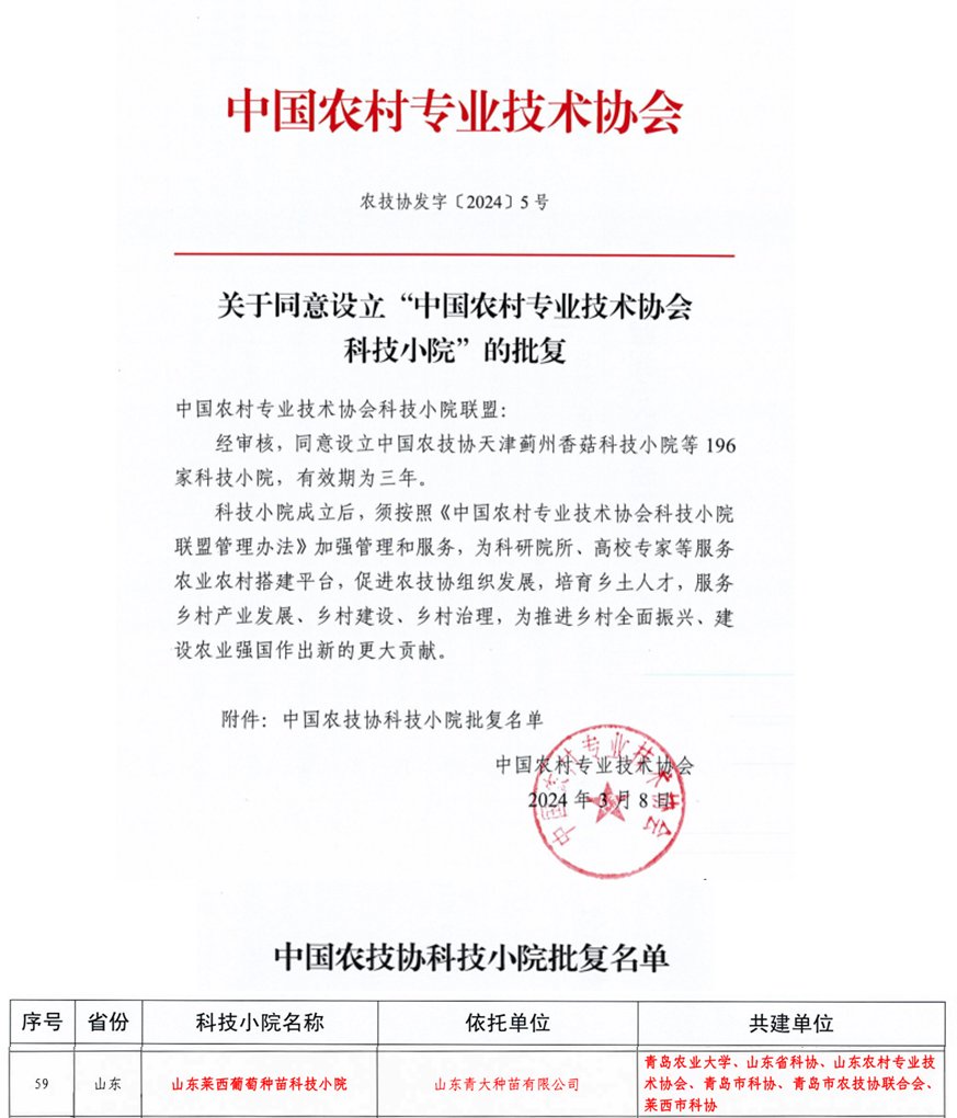 日前,中国农村专业技术协会公布《关于同意设立“中国农村专业技术协会科技小院”的批复》,在此次批复的196家科技小院中,我院刘新教授的葡萄优质抗逆研究团队与山东青大种苗有限公司联合申报的山东莱西葡萄种苗科技小院成功获批。科技小院建设是落实党的二十大关于教育、人才、科技一体部署、立足中国大地办教育的一次生动实践,是集人才培养、科学研究与社会服务于一体的农业科技社会化服务平台,是打造农村科普、推广现代农业科技、服务“三农”和乡村振兴的有效平台。