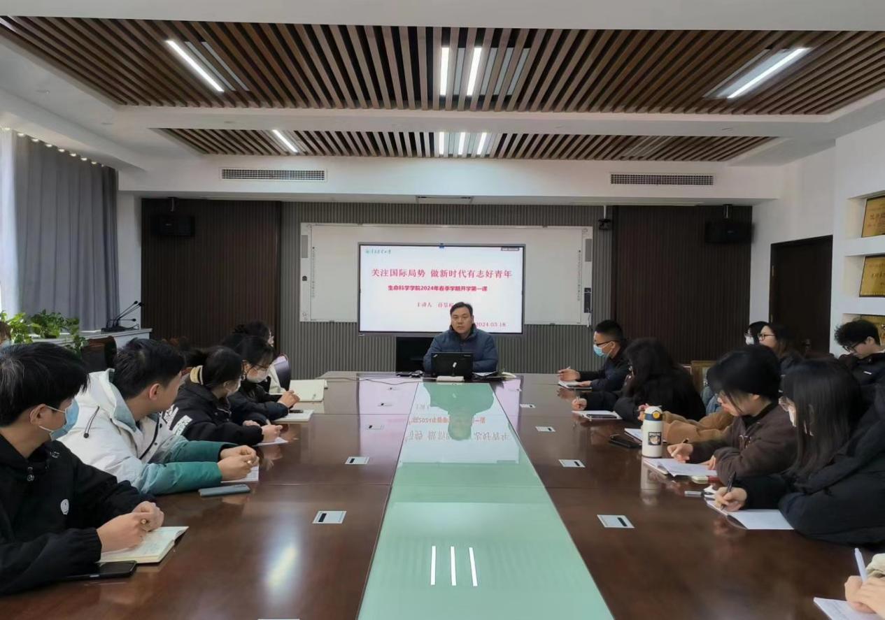 3月18日,生科学院党委书记孙景福在生物楼C305为学生干部讲授“关注国际局势,做新时代有志好青年”为主题的春季学期第一课。学院学生会、学院发展中心成员,部分学生党员参加会议。
