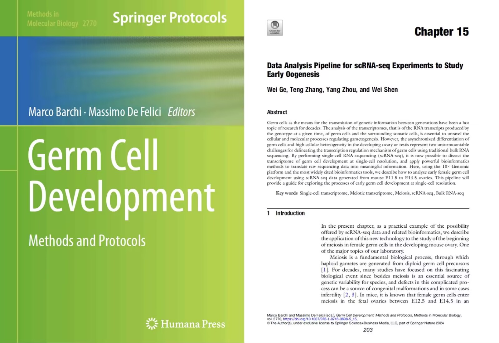 2月15日,新葡萄8883官网AMG沈伟教授团队参与编著的《Germ Cell Development》在线出版。该书为Springer Nature出版社《Methods in Molecular Biology》系列图书,由意大利罗马第二大学的Marco Barchi教授和Massimo De Felici教授担任主编,参与编著团队包括来自剑桥大学、东京大学、米兰大学、蒙彼利埃大学、堪萨斯大学医学中心等数十家国际知名研究机构。新葡萄8883官网AMG沈伟教授团队负责撰写第十五章题为“Data Analysis Pipeline for scRNA-seq Experiments to Study Early Oogenesis”内容的编著。
